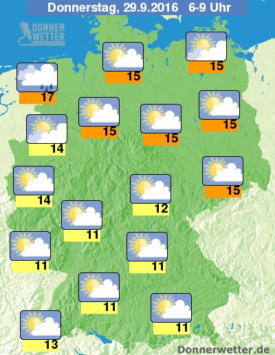 Die Temperaturen liegen bei Werten um 11 bis 14 Grad C in der Südwest- und um 15 bis 17 Grad C in der Nordosthälfte.