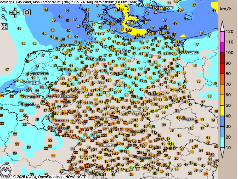 Die Lufttemperaturen- und Böenkarte für den frühen Sonntagabend (18:00 Uhr) nach GFS: