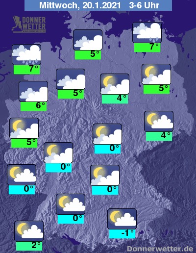 Bei längerem Aufklaren gehen die Temperaturen im Süden stellenweise in den leichten Frostbereich zurück und es droht dann die Gefahr von Glätte durch überfrierende Nässe. Sonst bleibt es bei Werten von meist 7 bis 2 Grad frostfrei.
