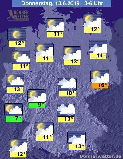 In der Nacht zeigt sich der Himmel zunächst noch häufig locker oder aufgelockert bewölkt, im Nordwesten sowie entlang des Rheins funkeln die Sterne anfangs auch noch von einem sternenklaren Himmel. Im weiteren Nachtverlauf nimmt die Bewölkung dann vor allem im Süden und Osten Deutschlands zu, zwischen Harz und dem Altmühltal können zudem zeitweise Schauer fallen. Sonst bleibt es meist trocken.
