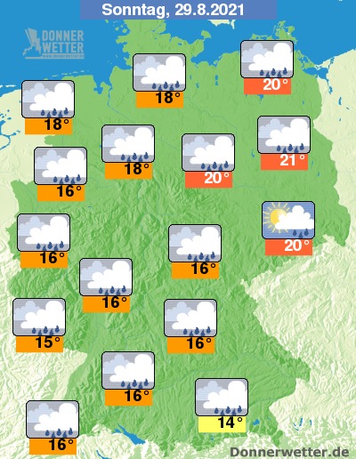 In der folgenden Nacht bleibt der Himmel bedeckt oder stark bewölkt, lediglich im Südwesten und über Sachsen ist der Himmel auch verbreitet nur locker bis wechselnd bewölkt, hier bleibt es meist trocken. Im übrigen Bundesgebiet bilden sich immer wieder Schauer. Die Temperatur sinkt auf 16 Grad in Cuxhaven und bis 9 Grad in Berchtesgaden.