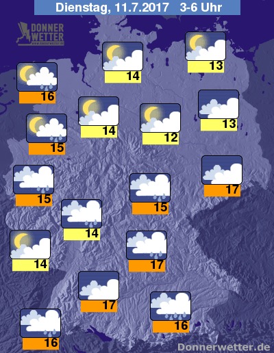 In der Nacht zum Dienstag ist es über dem Norden und Osten häufig aufgelockert, teils auch stark bewölkt, jedoch dabei weitgehend trocken. Über die Südwesthälfte des Landes und auch entlang des Niederrheins und der Ems bis zur Nordsee ziehen überwiegend kompakte Wolken durch, die sowohl für Schauer als auch für einzelne Gewitter sorgen. Die Temperatur sinkt auf 17 Grad in Nürnberg und bis 12 Grad rund um Magdeburg.