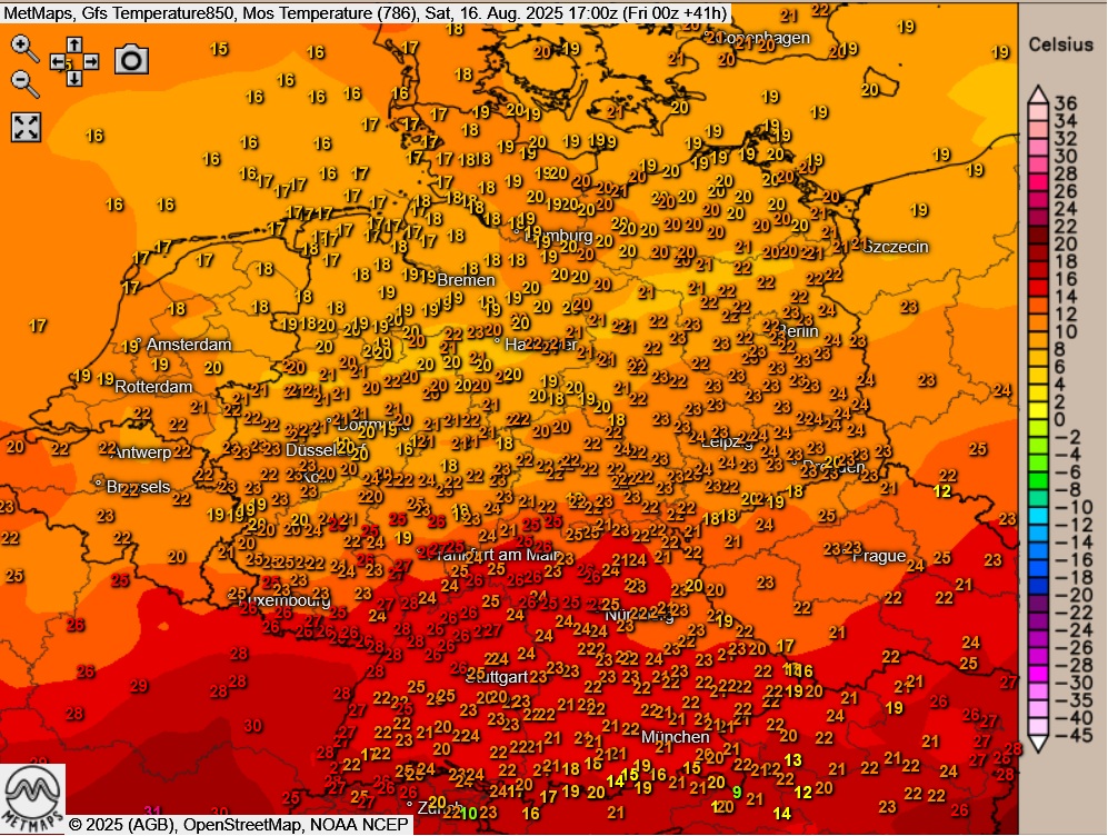 Die Karten bilden die Temperaturen (17:00 Uhr) sowie die Sechs-Stunden-Regenmengen für Bayern (bis 23:00 Uhr) nach GFS ab.