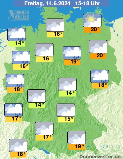 Am Nachmittag zeigt sich der Himmel über weiten Landesteilen stark bewölkt, Chancen auf ein paar Sonnenstrahlen bestehen  am ehesten in Teilen der Ost- und Südosthälfte sowie an der Ostseeküste. Hier bleibt es nachmittags auch weitgehend trocken, in den übrigen Landesteilen sind von Westen her immer wieder teils kräftige Schauer und lokale Gewitter möglich.
