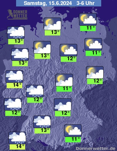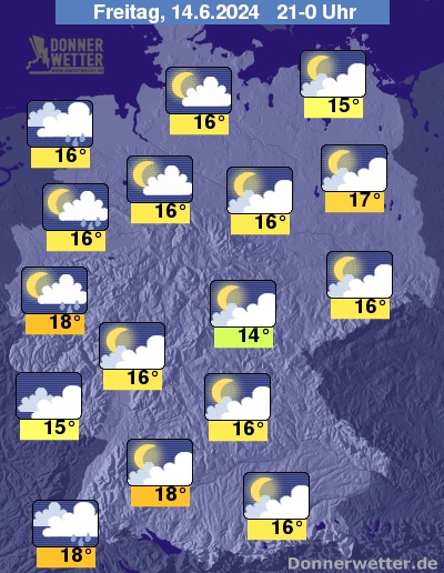 In der Nacht auf Samstag zeigt sich der Himmel über dem Westen und Nordwesten stark bewölkt oder bedeckt, dabei sind teils kräftige Schauer und Gewitter möglich. Vom Südwesten bis in die Mitte fällt teils anhaltender Regen. In den übrigen Landesteilen bleibt es teils wechselnder, teils geringer Bewölkung weitgehend niederschlagsfrei.