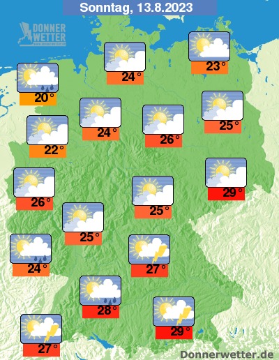 Heute zeigt sich das Wetter oft heiter bis sonnig, gebietsweise ziehen aber auch einige, teilweise dichte Wolken durch. Im Süden und Nordwesten bilden sich lokale Schauer, seltener auch Gewitter. Im übrigen Land bleibt es weitgehend trocken bei Werten von 20 Grad in Wilhelmshaven und bis 29 Grad in München.