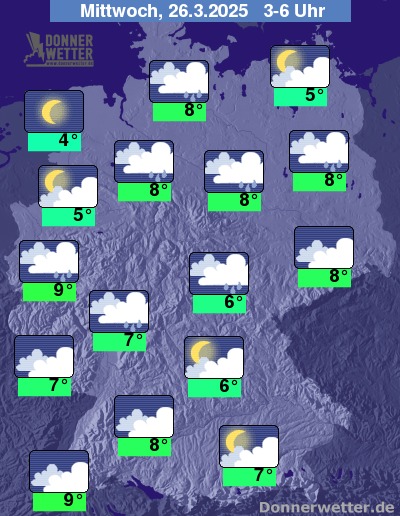 In der Nacht zum Mittwoch ziehen sich im Süden letzte Schauer an die Alpen zurück, danach lockern die Wolken zunehmend auf, lokal kann sich auch Nebel bilden. In den übrigen Landesteilen zeigt sich der Himmel meist stark bewölkt, dabei fällt ausgangs der Nacht verbreitet etwas Regen.