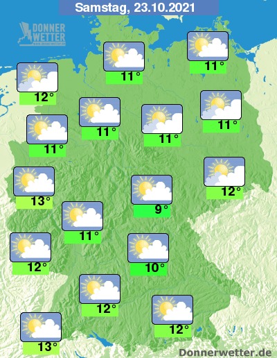 Am Samstag ist es häufig heiter bis sonnig, hier und da ziehen aber auch dichte Wolken durch oder es ist trüb, dabei bleibt es aber trocken. Die Temperatur erreicht 9 Grad im Grabfeld und bis 13 Grad im Rheinland.
