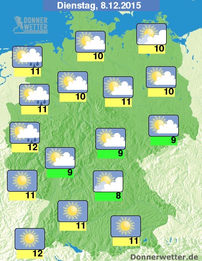 Am Dienstag gibt es einen Mix aus Sonne und meist locker bis aufgelockerten Wolken. Im Süden und Südwesten ist es auch verbreitet sonnig. Es bleibt zunächt trocken, im Laufe des Nachmittags und Abends können jedoch im Westen und Nordwesten dichte Wolken und Regen aufziehen. Die Temperatur steigt auf 8 bis 12 Grad.