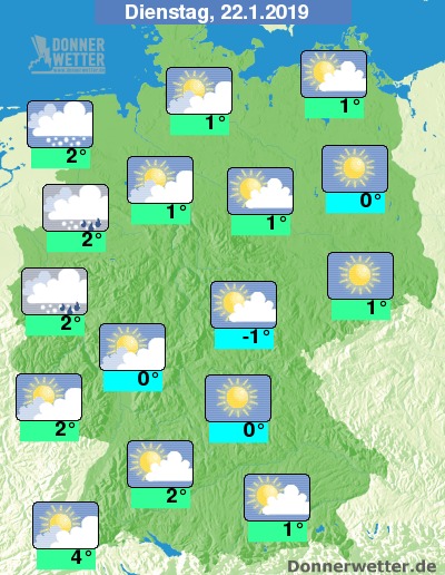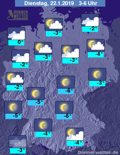 In der Nacht muss mit keinen Niederschlägen gerechnet werden, doch die Bewölkung nimmt teils zu. Die Temperaturen sinken auf kalte -6 Grad C in Thüringen und -2 Grad in der Eifel.
