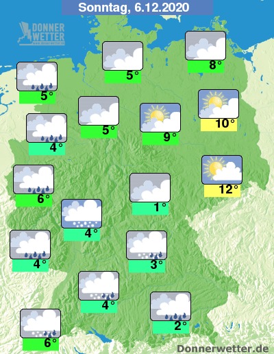 Der zweite Adventssonntag beschert weiten Landesteilen dichten Wolken, aus denen vor allem im Westen und Süden Deutschlands immer wieder Regen fällt. In den höheren Lagen fallen die Niederschläge auch als Schneeregen oder Schnee. Bei zeitweisen Auflockerungen überwiegend trocken bleibt es am Sonntag vor allem östlich der Elbe.