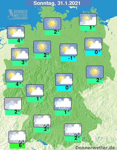 Am Sonntag bleibt es im Süden bedeckt und es fällt hier zeitweise Schnee, Schneeregen oder Regen, im Osten und Norden ist es oft heiter bis aufgelockert, sonst auch teils stark, teils aufgelockert bewölkt, dabei bleibt es weitgehend trocken. Die Temperatur steigt auf -1 Grad in Magdeburg und bis zu 6 Grad in Freiburg.