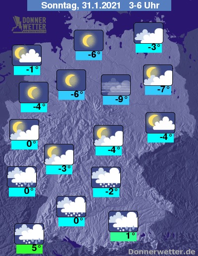 In der kommenden Nacht fällt im Süden unter dichten Wolken verbreitet Schnee. Vom Breisgau bis nach Berchtesgaden auch Schneeregen oder Regen. Über der Nordhälfte des Landes ist es meist locker bewölkt oder sternenklar, im übrigen Land ist es auch teils stark, teils aufgelockert bewölkt, dazu bleibt es trocken. Die Temperatur sinkt auf 5 Grad in Freiburg und auf -9 Grad im Westhavelland.
