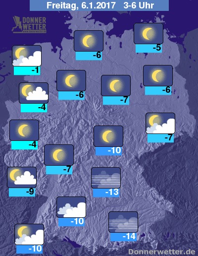 In der Nacht wird es dann vor allem in der Südhälfte bitterkalt. Unter aufklarendem Himmel fällt das Thermometer stellenweise auf bis zu -15 Grad. In den Morgenstunden bilden sich vereinzelte Nebelfelder.