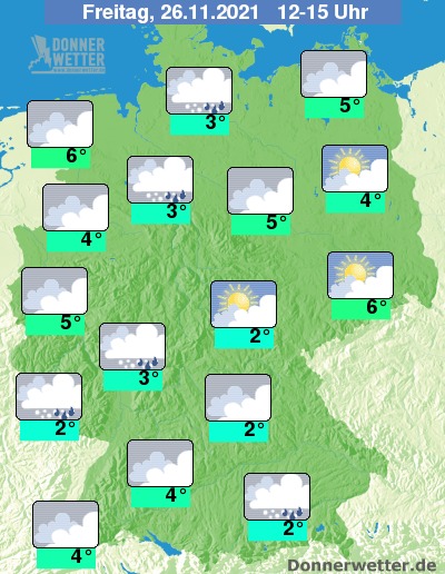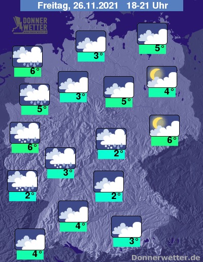 Heute Abend ist es bis auf wenige Ausnahmen im Osten verbreitet bedeckt und über der Nordwesthälfte Deutschlands fällt verbreitet Regen, Schneeregen oder Schnee, teils ist es hier auch neblig-trüb. Im übrigen Land bleibt es weitgehend trocken und hier und da ebenfalls neblig-trüb. Die Temperatur liegt bei 2 Grad in Jena und etwa 6 Grad in Köln.