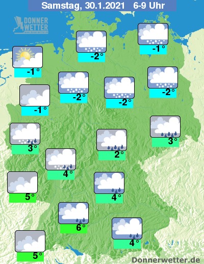 Der Samstag startet verbreitet mit einer geschlossenen Wolkendecke, im äußersten Nordwesten sind auch einzelne Auflockerungen möglich. Verbreitet muss in den Frühstunden mit Niederschlägen gerechnet werden, die im Norden und Nordosten meist als Schnee, sonst als Schneeregen oder Regen niedergehen. Häufiger trocken bleibt es am Samstagmorgen im Nord- und Südwesten Deutschlands.