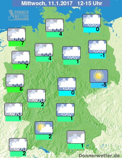 Die Temperaturen erreichen Höchstwerte um -5 Grad C in Dresden und um 7 Grad C in Ostfriesland.