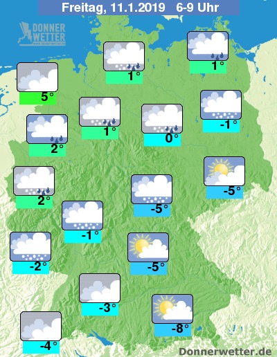 Die Temperaturen erreichen Werte um -8 Grad C am Alpenrand und um 5 Grad C in Emden.