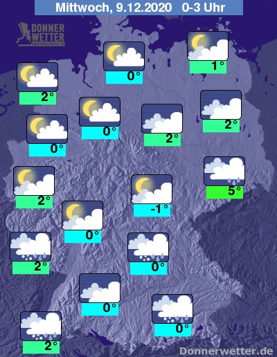 Während der zweiten Nachthälfte fällt im Süden und Südosten des Landes gebietsweise etwas Regen, in höheren Lagen auch Schnee oder Schneeregen mit der Gefahr von Straßenglätte. Im Norden kann man Halbmond und Sterne zum Teil noch längere Zeit beobachten.