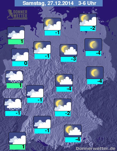 In der kommenden Nacht bleibt es in der Osthälfte des Landes überwiegend aufgelockert, oder auch nur leicht bewölkt, im Osten wird es gebietsweise sternenklar. Dagegen verdichten sich die Wolken von Westen her zunehmend und nach Mitternacht setzt in den westlichsten Landesteilen Schneefall oder Schneeregen ein, der bis zum Morgen auch Hessen, Baden-Württemberg und das westliche Niedersachsen erreicht. Dabei weht teils kräftiger Wind mit der Gefahr von Schneeverwehungen. Auf den Straßen kann es vielerorts glatt werden. Die Temperatur sinkt auf 1 Grad in Köln und bis -4 Grad in der Lausitz.