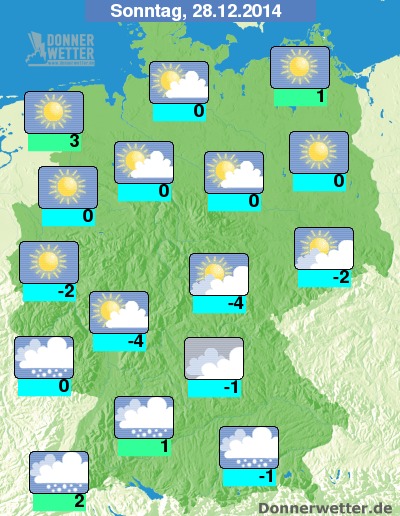 Am Sonntag fällt im Süden des Landes weiterhin zeitweise Schnee, der sich im Laufe des Tages aber immer weiter in Richtung des Alpenvorlands zurückzieht, ansonsten erwarten wir einen verbreitet ruhigen und trockenen Wintertag mit häufigem Sonnenschein. Es ziehen meist nur lockere Wolken umher und vielerorts ist es sogar sonnig. In der Mitte des Landes können sich gebietsweise jedoch auch zähere Wolken halten. Die Temperatur steigt auf -4 Grad im Coburger Land und bis 3 Grad an der Nordseeküste.