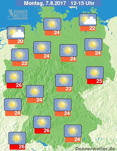 Heute Nachmittag strahlt die Sonne über dem Land von einem überwiegend wolkenlosen Himmel. Hier und da, jedoch vor allem in Küstennähe ziehen lockere Wolken durch, dabei bleibt es trocken. Die Temperatur liegt bei 20 Grad an der Nordseeküste und um 26 Grad im Oberrheingraben.