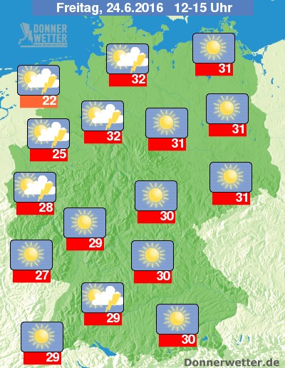 Heute Nachmittag können sich besonders im Nordwesten, aber auch im Westen und vereinzelt auch im Südwesten Schauer und zum Teil sogar schwere Gewitter entwickeln. Im übrigen Land bleibt es dagegen verbreitet sonnig und dabei trocken. Die Temperatur liegt bei 22 Grad an der Nordsee und heißen 31 Grad in Berlin.