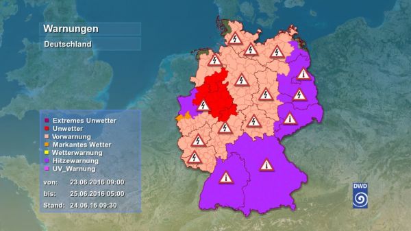 Nach wie vor gilt zwischen Kassel, Bremen, dem Münsterland, dem östlichen Ruhrgebiet und dem Sauerland eine Unwetterwarnung des Deutschen Wetterdienstes. Gewarnt wird vor schweren Gewittern mit heftigem Starkregen und Hagel. Die Unwetter ziehen im weiteren Tagesverlauf weiter in Richtung Nordosten, sodass auch in vielen weiteren Regionen bereits Vorwarnungen vorliegen.