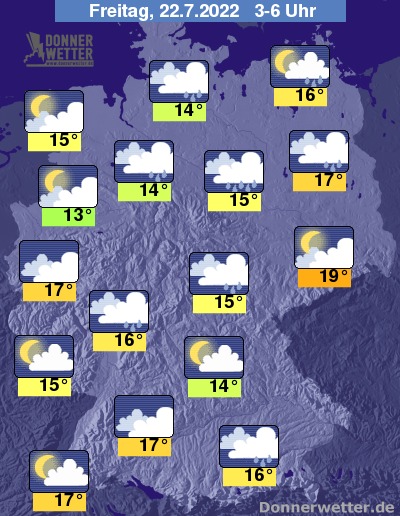 In der Nacht zum Freitag lockert es vor allem im Süden häufig auf, hier bleibt es zum Großteil trocken. Sonst zieht hingegen oft dichte Bewölkung durch und es bilden sich gebietsweise Schauer, jedoch nur noch selten Gewitter. Die Temperatur sinkt auf 19 Grad in Dresden und etwa 13 Grad in Meppen.