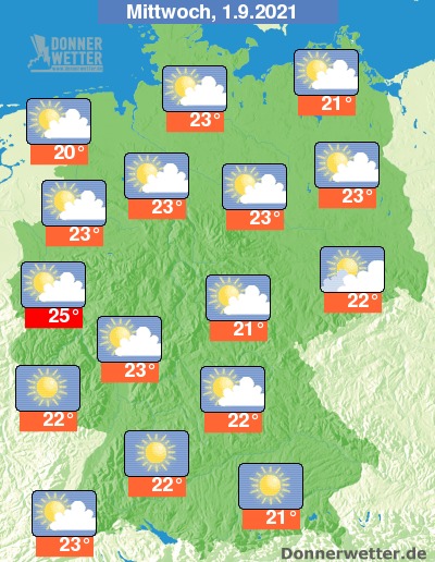 Heute zeigt sich der Tag verbreitet heiter oder sonnig, gebietsweise ziehen auch mal einige Wolken durch, jedoch bleibt es landesweit trocken. Die Temperatur steigt auf 20 Grad in Emden und bis 25 Grad in Bonn.