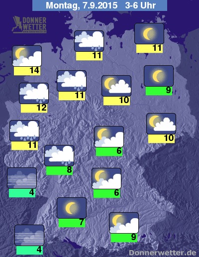 In der Nacht zum Montag ziehen im Norden und Westen der Republik verbreitet dichte Wolken mit Regen auf. Die Niederschläge breiten sich im weiteren Verlauf auch bis in die Landesmitte hin aus. Im übrigen Bundesgebiet ist es hingegen oft sternenklar oder nur locker bewölkt, nur hier und da ziehen auch mal dichtere Wolkenfelder durch, dabei bleibt es trocken. Die Temperatur sinkt auf 12 Grad in Papenburg und bis 4 Grad am Oberrhein.