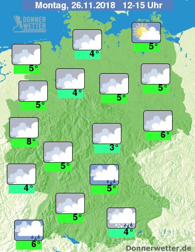 Am Montagmittag und -nachmittag zeigt sich der Himmel über weiten Landesteilen stark bewölkt oder bedeckt, nordöstlich der Elbe stehen die Chancen auf ein paar Sonnenstrahlen bundesweit am besten.