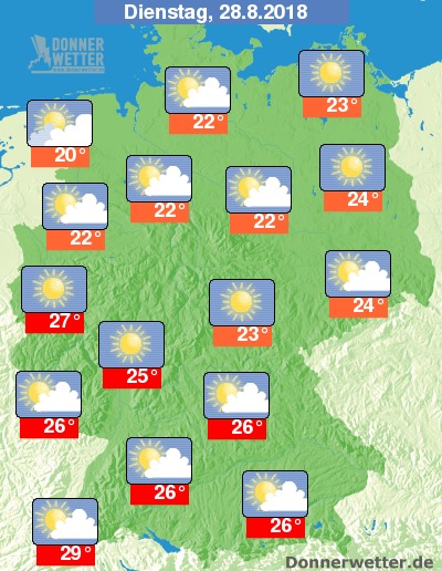 Am Dienstag ist es verbreitet heiter oder sonnig und nur selten ziehen auch mal mehr Wolken durch, dabei bleibt es landesweit trocken. Die Höchstwerte liegen bei 20 Grad an der Nordsee und etwa 29 Grad im Oberrheingraben.