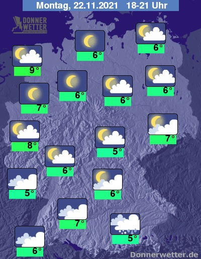 Heute Abend bleibt es im Alpenvorland bedeckt und es fällt hier gebietsweise Regen oder Schnee. Im übrigen Land zeigt sich der Himmel verbreitet locker bewölkt und oft auch sternenklar. An der Nordsee ziehen jedoch neue Wolken auf, die hier nachfolgend Schauer bringen können. Die Temperatur liegt bei 5 Grad in München und etwa 9 Grad in Wilhelmshaven.