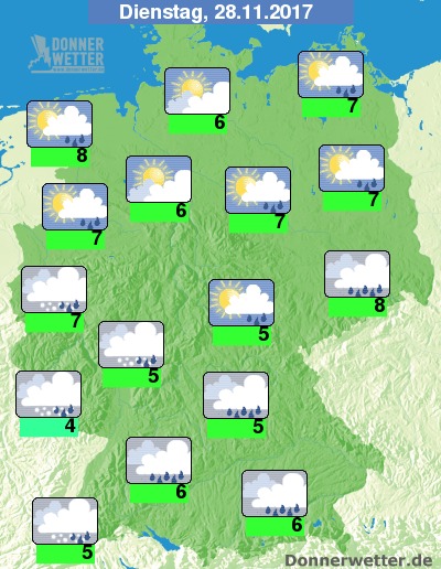Am Dienstag ist es über Sachsen und dem Süden dicht bewölkt und hier fällt immer wieder Regen, sonst ist es im Land auch oft leicht bis aufgelockert bewölkt und lange Zeit trocken, einzelne Schauer sind dennoch möglich. Die Temperatur erreicht 4 Grad im Saargau und bis 8 Grad im nördlichen Emsland. An den Küsten weht ein starker und teils stürmischer Wind.
