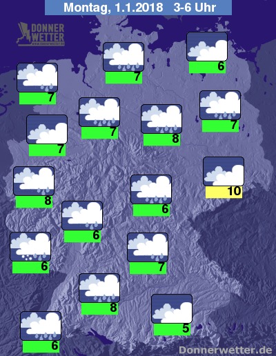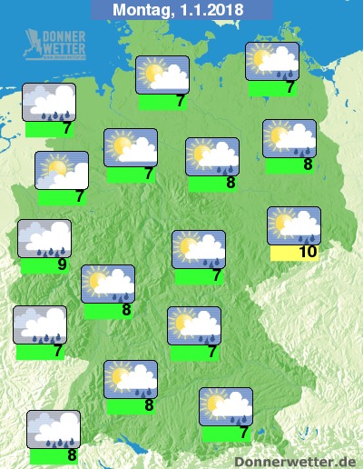 Am Neujahrstag ist es teils locker bis aufgelockert, teilweise ist es aber auch stark bewölkt, dazu können sich hin und wieder einzelne Schauer bilden, oft ist es aber auch trocken. Die Temperatur steigt auf 7 bis 10 Grad.