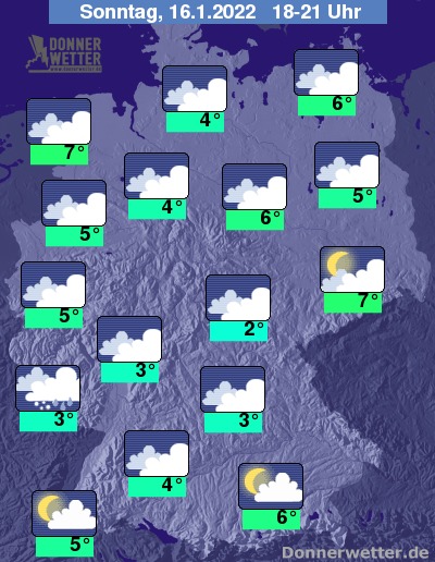 Heute Abend ist es verbreitet wolkenverhangen. Oft noch locker bis aufgelockert bewölkt ist es lediglich am Alpenrand, hier bleibt es komplett trocken, sonst fallen lokal ein paar wenige Tropfen oder Flocken. Häufig ist es neblig-trüb. Die Temperatur liegt bei 2 Grad in Erfurt und bis zu 7 Grad in Bremerhaven.