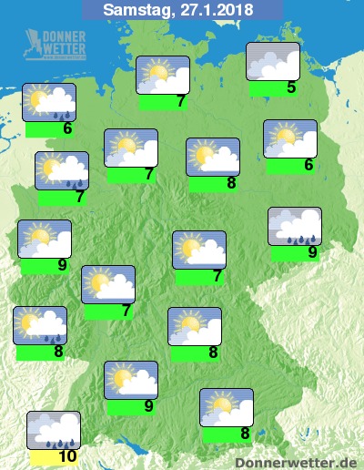 Am Samstag kann sich häufig die Sonne zwischen oft nur wenigen Wolken zeigen. Besonders im Südwesten und über Sachsen bringen dichte Wolken hier und da allerdings auch Regen. Die Temperatur steigt auf weiterhin milde 5 bis 10 Grad.