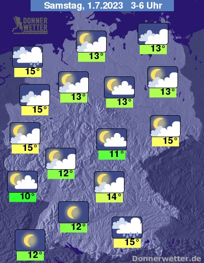 In der Nacht zum Samstag fällt an den Alpen und im Südosten des Landes unter dichten Wolken zeitweise Regen, sonst ist es wechselnd bis stark bewölkt und zunächst trocken. Im Laufe der zweiten Nachthälfte ziehen dann dichte Wolken mit Regen in den Nordwesten des Landes. Die Temperatur sinkt auf 15 Grad am Niederrhein und 10 Grad im Saargau.