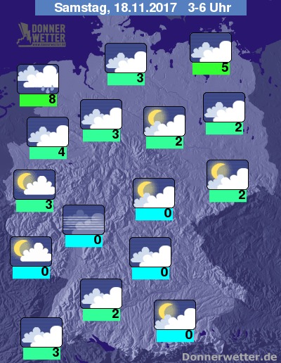 In der kommenden Nacht zieht sich der Himmel über Norddeutschland immer weiter zu und im Umfeld der Nordsee bilden sich einzelne, teils kräftige Schauer, hier weht der Wind häufig stark. Im übrigen Land ist es teils locker, teils stärker bewölkt, jedoch trocken. Die Temperatur sinkt auf 8 Grad an der Nordsee und bis 0 Grad in Mittelfranken.
