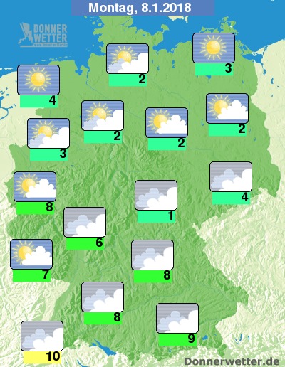 Am Montag scheint im Norden häufig die Sonne, oft ist es sogar wolkenlos. Weiter nach Süden hin bleiben die Wolken hingegen meist dicht, Regen ist aber auch hier nicht zu erwarten. Vor allem westlich des Rheins lockert die Bewölkung auch auf. Die Temperatur erreicht nur 1 Grad im Thüringer Becken und bis 10 Grad im Breisgau.