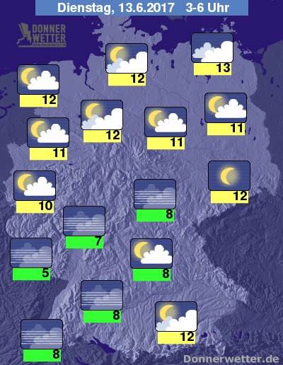 In der Nacht zum Dienstag halten sich im Ostseeumfeld oft dichte Wolken, die hier auch Regen bringen können. Im übrigen Bundesgebiet zeigt sich der Himmel zum Großteil sternenklar und ansonsten locker bewölkt, dazu bleibt es trocken. Die Temperatur sinkt auf 13 Grad in Rostock und bis 5 Grad im Saargau.