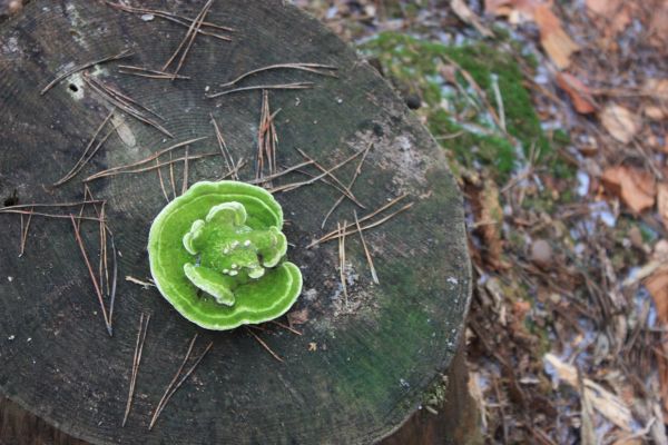 An vielen Stellen in Deutschland kann man Haarwolle beobachten, die sich bei leichtem Frost bildet. Hier haben wir etwas Reif und Eis auf einem Pilz auf einem alten Baumstamm.