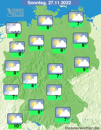 Am Sonntag ist es über dem Osten und Südosten teilweise heiter, im übrigen Land ist es nur anfangs noch oft aufgelockert bewölkt, sonst ist es jedoch meist trüb oder stark bewölkt. Im Nordwesten setzt im Laufe des Tages Regen ein, sonst bleibt es trocken. Die Temperatur steigt auf 6 Grad in Wiesbaden und bis 10 Grad in Freiburg.