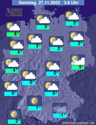 In der Nacht zum Sonntag zeigt sich der Himmel verbreitet locker bewölkt, vor allem im Süden auch sternenklar. Hier und da kann sich Nebel oder Hochnebel bilden. Es bleibt trocken bei Tiefstwerten von 6 Grad in Bremerhaven und -1 Grad in Augsburg.