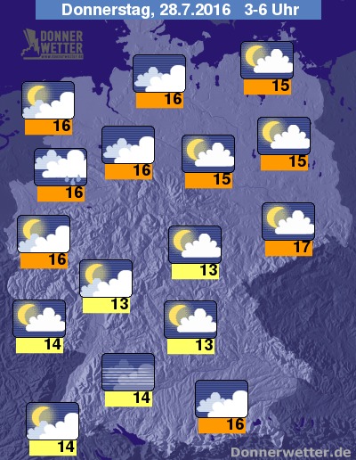 In der folgenden Nacht bilden sich in den östlichsten Landesteilen anfangs noch häufig Schauer und mögliche Gewitter. Im weiteren Nachtverlauf und im übrigen Bundesgebiet ist der Himmel zumeist locker oder aufgelockert bewölkt und es bleibt zunächst trocken. In der zweiten Nachthälfte ziehen im Westen und Nordwesten jedoch oft dichte Wolken auf und es bilden sich gebietsweise Schauer. Die Temperatur sinkt auf 17 Grad in der Lausitz und etwa 13 Grad im Eichsfeld.