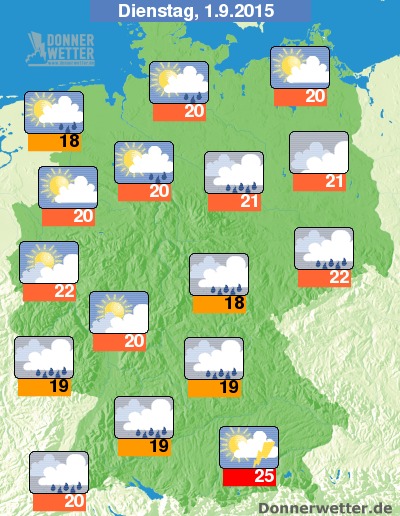 Am Dienstag ist es verbreitet wechselnd oder stark bewölkt und es können sich wiederholt Schauer und auch einzelne Gewitter bilden. Die Temperatur steigt auf 18 Grad an der Ems und bis 25 Grad in München.