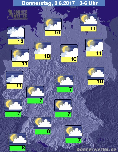 In der folgenden Nacht ist direkt an der Nordsee etwas Regen möglich, sonst ist der Himmel über Norddeutschland meist aufgelockert bewölkt und es bleibt trocken. In den übrigen Landesteilen ist es meist nur gering oder locker bewölkt und ebenso trocken. Die Temperatur sinkt auf 13 Grad in Emden und bis 7 Grad am Odenwald.
