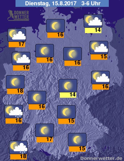 In der Nacht zum Dienstag zeigt sich der Himmel größtenteils sternenklar, lockere Wolken ziehen über Teile Niedersachsens, sowie in einem breiten Streifen von Vorpommern bis nach Sachsen. Teils dichte Wolken sind entlang des Oberrehins möglich, hier können sich auch vereinzelt Schauer und Gewitter entwickeln, sonst bleibt es hingegen trocken. Die Temperatur sinkt auf 18 Grad in Freiburg und bis etwa 14 Grad an der Müritz.