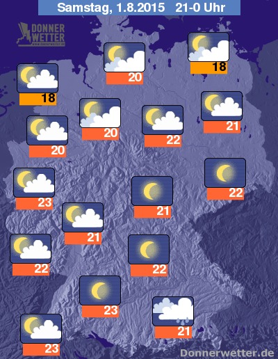 In der Nacht zum Sonntag ist es im Süden und im Nordosten Deutschlands meist stark, teils auch aufgelockert bewölkt. Im übrigen Bundesgebiet ist es dagegen meistens sternenklar, hier und da aber auch locker bewölkt. Es bleibt überall trocken und die Temperatur sinkt auf 15 Grad in Wismar und bis 11 Grad in Ostwestfalen.